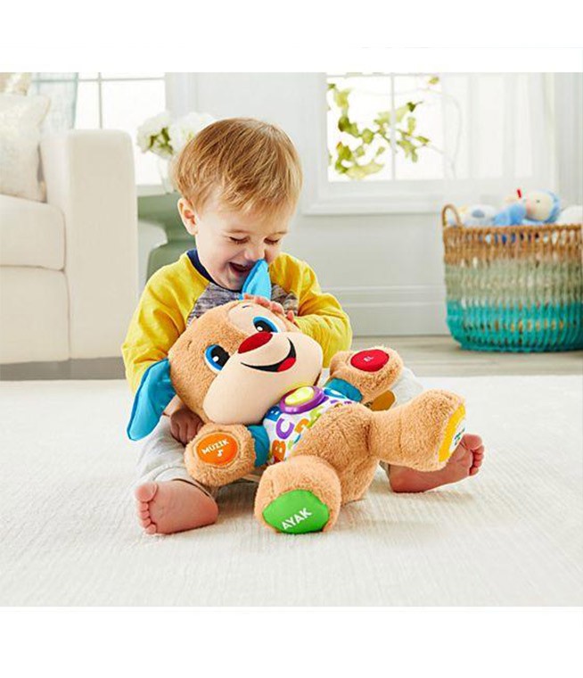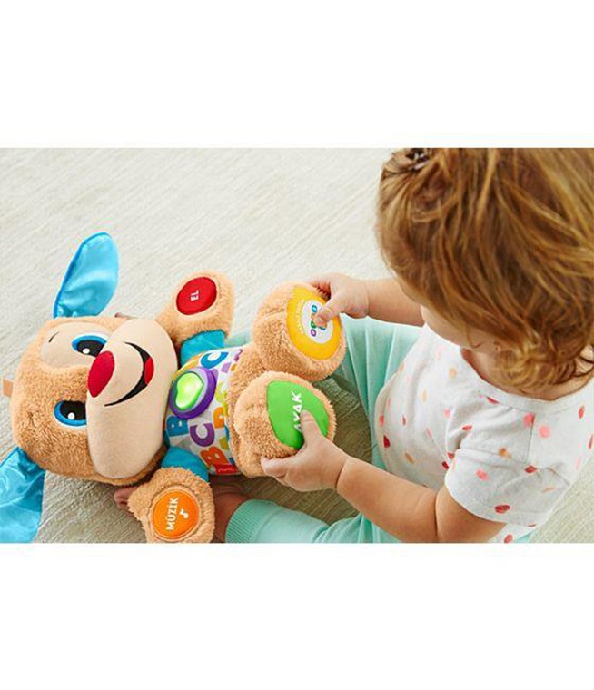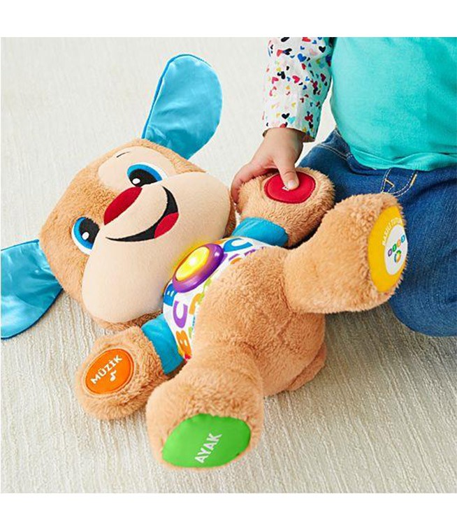 Eğitici Köpekçik her zamanki gibi bebeğinizin dokunuşlarına eğlenceli şeyler söyleyerek cevap veren veya şarkılar çalan, yumuşak ve sevimli bir köpekçik. Üstelik artık, bebeğiniz büyüdükçe öğretici içeriği değişen Yaşa göre gelişim teknolojisine de sahip! Her bebek farklı bir hızda büyüyüp geliştiği için, Yaşa göre gelişim teknolojisi size bebeğiniz için en uygun olan aşamayı seçme imkanı sunar. Bu üç gelişim aşaması içerisinde farklı gelişim aşamalarına uygun şarkılar, cümleler ve sesler bulunur. Eğitici Köpekçiğin ışıklı kalbinin ışıkları müziğin ritmine uygun olarak yanıp söner.